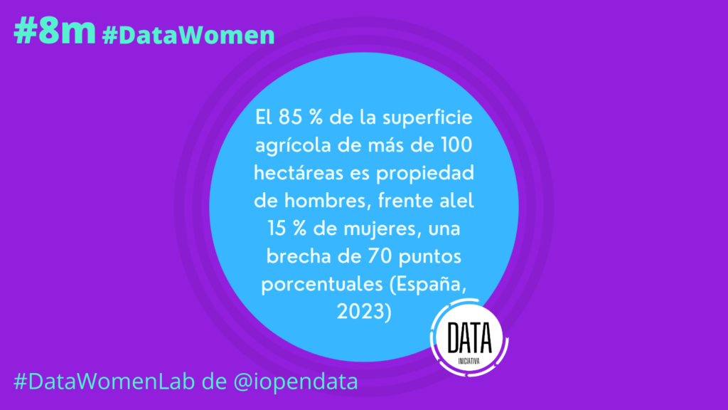 La titularidad de grandes explotaciones agrícolas sigue concentrándose mayoritariamente en manos de hombres. En 2023, el 85 % de la superficie agrícola de más de 100 hectáreas era propiedad de hombres frente al 15 % de mujeres en España, lo que supone una brecha de 70 puntos porcentuales en la propiedad de grandes explotaciones.